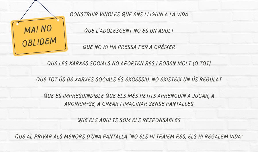 Actualment, hi ha una sobreprotecció per la salut física dels nens i de les nenes, però no tanta per la salut mental. Segons el Dr. Villar, “cicatritza més de pressa un trauma físic que no un de mental”. El psicòleg va assenyalar que és imprescindible que els més petits aprenguin a jugar, a avorrir-se, a crear i a imaginar sense una pantalla al davant, i que els adults són els responsables d’invertir temps en aquesta educació i enfrontar els reptes que se’ls presentin.